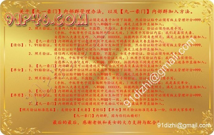 1、关于夫妻/情侣/单女验证:北上广不相信眼泪,交友圈只相信验证。如果大家对于上述条条框框的文字心存疑虑,我并不觉得你们足够真实真诚且真正准备好了,安安静静的做一名吃瓜群众其实也挺好。(备注:试图想凭91登录页面截图且无91验证贴入群的只能证明你是91视频区300大洋会员号,试图想凭结婚证或婚纱照入群的只能证明你是已婚单男,诸如此类的客官请自重!)