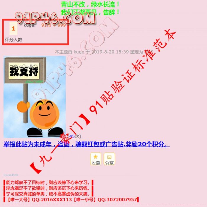 2、关于单男验证:单男凭91验证贴入群。无法提供91验证贴的单男,唯有凭借自己的真实真诚及过人之处入群。请单男朋友们理性对待,切勿麻木追捧。在这个比例严重失调的交友圈,旱的旱死涝的涝死,我能真正意义上带入活动现场中的单男朋友屈指可数,除非你真实真诚且有过人之处。我最最最想对单男朋友们说一声:授人以鱼不如授人以渔。(备注:谢绝红包!谢绝红包!谢绝红包!你若给我发红包,其实是在贬低你自己的身份。我若收取你红包,其实是在降低我交友的原则。我并非圣贤之人,但是君子爱财取之有道。红包确实可以快速过滤意淫嘴炮单男的骚扰,但是红包绝对无法衡量判定单男的素质优秀与否,以红包体现的素质真的好廉价。我从来不同情精虫上脑被当韭菜收割的单男,可怜之人必有可恨之处,正是由于此类自愿被红包收割的单男助长了骗子及91论坛的歪风邪气。真有这份心意的话,将红包用在提升活动吃住行的品质上吧!)